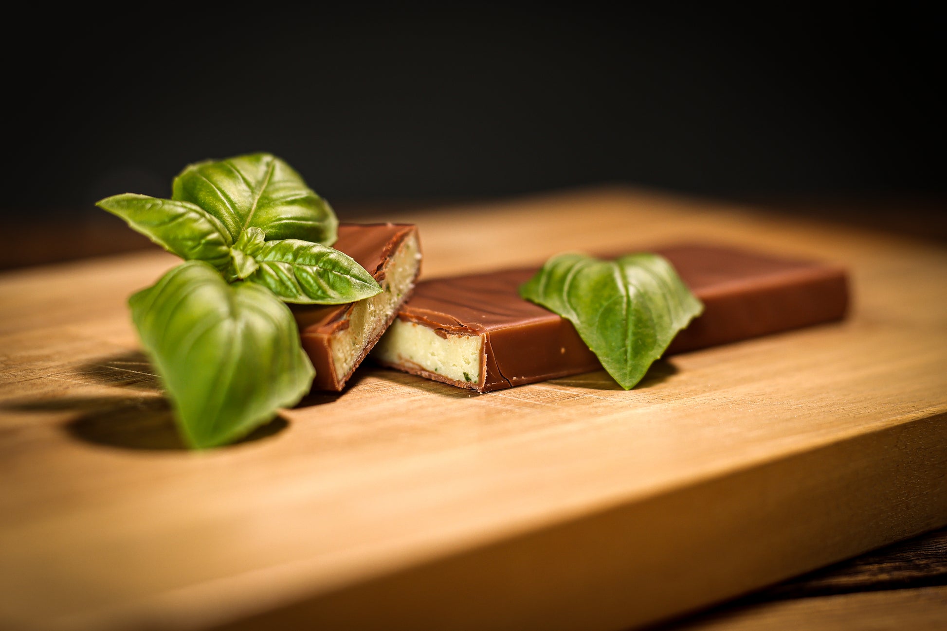 Basilikum Gin Schokolade mit Gin und dem intensiven Aroma von frischem Basilikum für Schokoladen- und Basilikum-Liebhaber.